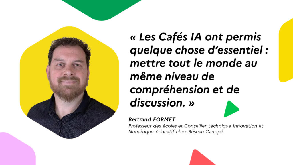 « Pour moi, les Cafés IA ont permis quelque chose d’essentiel : mettre tout le monde au même niveau de compréhension et de discussion. Pour la première fois peut-être, l’agent administratif, la formatrice, l’enseignant, les élèves, leurs parents, l’inspectrice ou la cheffe d’établissement, des personnels d’un ministère voire même leur Ministre se trouvent confrontés aux mêmes questionnements et au même besoin d’apprentissage. Personne n’a plusieurs années d’avance sur les autres : nous avançons ensemble. L’intérêt suscité par ces questions est considérable : nous avons, par exemple, accueilli dans nos formations dédiées aux IA génératives 35 000 personnes au cours de la dernière année scolaire. Dans ce contexte, les Cafés IA deviennent une modalité de formation comme celles que nous mettons déjà en place, des lieux de réflexion collective, où les idées se structurent et où l’on construit une compréhension commune plutôt qu’une expertise isolée. Cette dynamique renforce notre capacité à travailler en réseau et à partager la réflexion plutôt qu’à la cloisonner.