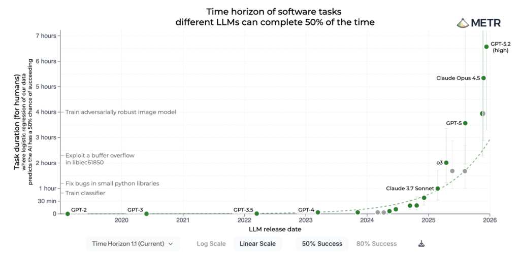 Sur METR, un ensemble de données mesure en temps de travail ce que les modèles peuvent faire sans intervention humaine. Il y a un an, cette durée était d’environ dix minutes. Désormais, elle est de plusieurs heures. Et le graphique n’est pas à jour sur les dernières versions des modèles… Le 5 février, OpenAI a publié GPT-5.3 Codex, un modèle qui a contribué lui-même et de manière déterminante à sa propre construction. Il ne s’agit plus d’une prédiction, mais de ce qui est déjà en train d’arriver. Pour Dario Amodei, PDG d’Anthropic, l’IA écrit désormais une grande partie du code. « Il estime que nous ne sommes peut-être qu’à un ou deux ans du moment où la génération actuelle d’IA construira la suivante de manière autonome ».